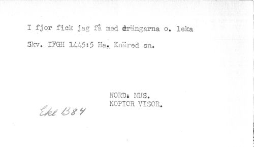 //// I fjor fick jag få med drängarna o. leka } //// Skv. IFGH 1445:5 Ha. Knäred sn. //// NORD; ms. //// KOPIOR VISOR. //// ! //// < //// ! //// ! ////