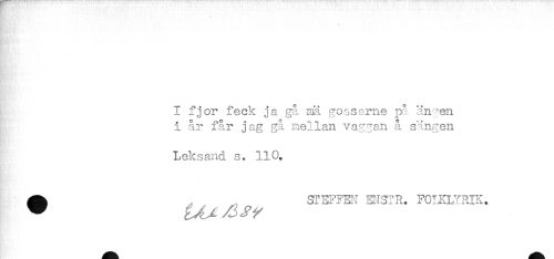 //// f!f -j- //// I fjor feck ja gå. mä gossarna på ängen //// i år får jag gå mellan vaggan å sängen //// Leksand s. 110. //// . //// ^ STEI^FEN MSTR. FO^KLYRIK. ////