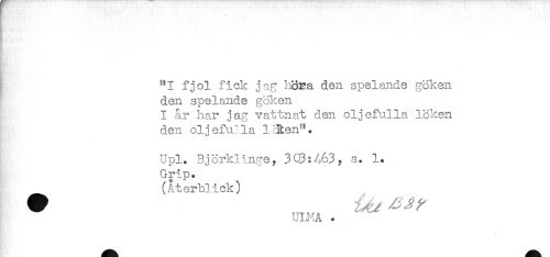 //// "I fjol fick jag köra den spelande göken //// den spelande göken //// I år har jag vattnat den oljefulla löken //// den oljefulla 1 Ren". //// Upl. Björklinge, 303:463, s. 1. //// Grip. //// (Återblick) //// U1MA . ////