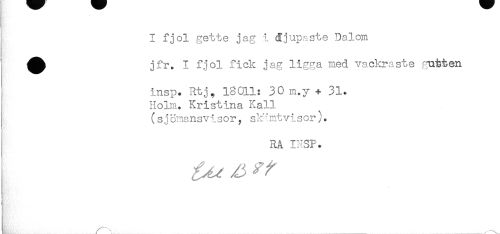 //// I fjol gette jag t djupaste Dalom //// I ^ jfr. I fjol fick jag ligga med vackraste gatten //// insp. Rtj, 13011: 30m.v+ 31. //// Holan. Kristina Kall //// (sjöiaansYisor, sk' cit v \.'or). //// RA I"SF. ////
