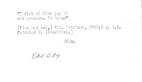 //// "fjol så fick jag gå //// med gossarna åt än^en" //// (Visa mod mel.) Vml.. Möklinga, 2795:3 s. 2,1. //// Palmblad (Återblick.) //// S! - //// ULMÅ. ////