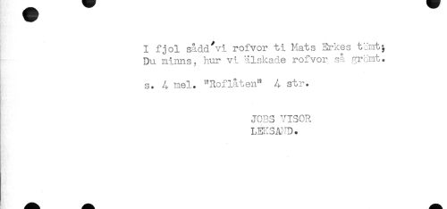 //// I fjol sådd'vi rofvor ti Mats Erkes t ont; //// Du minns? kur vi älskade rofvor så gromt. //// s. 4 nel. "Rofiåten^ 4 str. //// JOBS VISOR //// LEKSAND. ////