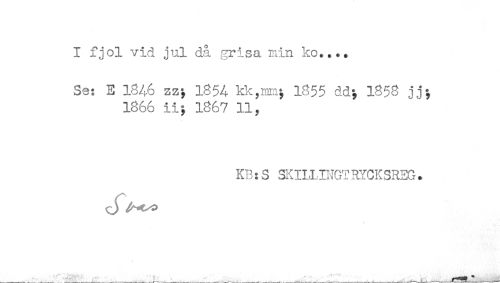 //// I fjol vid jul då gr i sa min ko.... //// Se: E 1846 zz^ 1854 kk,mm; 1855 dd; 1858 jj; //// 1866 ii; 1867 11, //// KB:S SKI1LINGTRYCKSREG. //// _____ ___;___..._______-_____jr-JL^, ////
