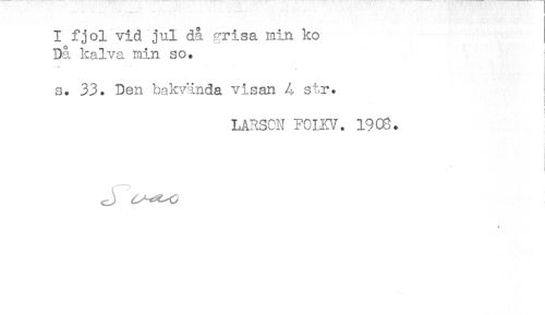 //// I fjol vid jul då grisa min ko //// Då kalva min so. //// s. 33. Den bakvända visan 4 str. i //// < //// LARSON FOLKV. 19 03. //// i ////