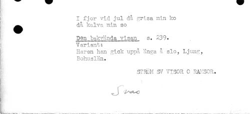 //// i I fjor vid jul då grisa. min ko //// ^^ då kalva min so //// Den bakvända visan, s. 239. //// Variant: //// Haren kan gick uppå änga å slo^ Ljujag, //// Bohuslän. //// I STRSH SV VISOR C RAMSOR. ////