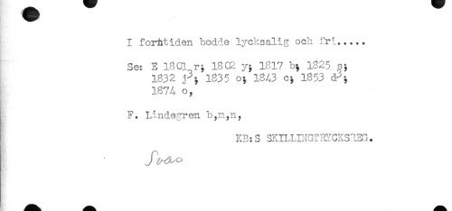 //// I foråtiden bodde lycksalig och fri..... //// Se: E 1801 r; 18C2 y; 1817 b; 1825 s; //// 1832 j3; 1S35 o. c; 1853 d-^; //// 187A o, //// F. Lindegren b,n,n, //// KB: S SKILLINGTRYCKSREG. ////