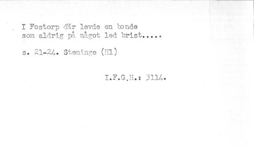 //// ) //// I Fostorp där levde en ionde //// som aldrig på något led brist..... //// s. 21-24. Steninge (Hl) //// I.F.G.H.: 3114* ////