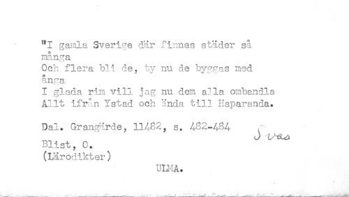 //// "I gamla Sverige där finnes städer så //// många. //// Och flera bli de, tv nu de bvp^as med //// ånga //// I glada rim vill jag nu dem alla ombandla //// Allt ifrån Ystad och ända till Haparanda. //// Dal. Grangärde, 11482, s. 482-484 r //// J t^^ //// Blist, C. //// (Lärodikter) //// ULMA. ////