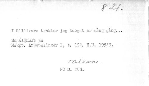 //// * i //// * //// I Gillivare trakter jag Imogat kr mång gång... ; //// Sm Älf-rkult sn //// Mskpt. Arbetssånger s. 192. E.U. 19549. //// t //// NO^D. MUS. //// - //// ! ////