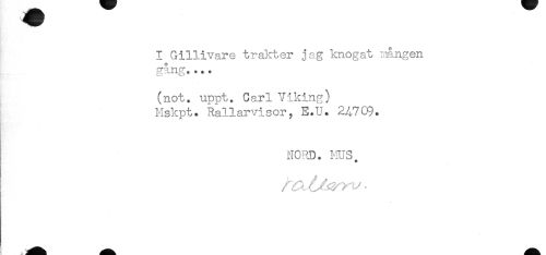 //// T Gillivare trakter jag knogat rrången //// gång.... //// (not. uppt. Carl Viking) //// Mskpt. Rallarvisor, E.U. 2^709. //// NORD. HUS. ////