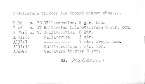 //// I Gällevara trakter jag knogat mången .gång.... //// B 36 s. 70 Gällevaravisa. 8 g,tr. kom. //// B 45 s. 27 Rallarvisa från Gellivara 8 str. kom. //// B 79:2 s. 53 Gällivaravisa 8 str. //// A 91:45 Rallarevlsa 5 str. //// A131:l -----3 str. fragm. kom. //// A131:ll Gel]ivaravisan 5 str. kom. //// A349:2 Gellivara trakter 8 str. //// RA. ^ ////