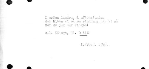 //// I gröna lunden, i aftonstunden //// där hitta vi oå en ringdans när vi gå //// Ser du jag har ringenL //// s.l. KS'.nge, Hl. D 310 //// I.F.G.H. 5096. ////