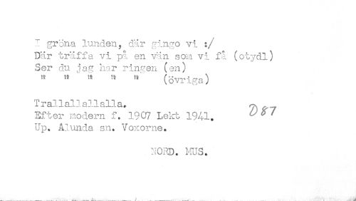 //// I gröna lunden, där gingo vi :/' //// Där träffa vi på en vän som vi få (otydl) //// Ser du ja,? har ringen (en) //// ^ " ' ^ (övriga) //// Trallallallalla.. . //// Efter modern f. 1907 Lekt 1941. ^ ^ ^ //// Up. Alunda sn. Voxorne. //// . NOPD. irus. ////