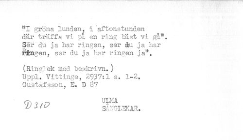 //// gröna lunden, i aftonstunden //// där träffa, vi på en ring tast vi gå" * //// Ser du ja har ringen, ser åu ja har //// lingen, ser du ja har ringen ja\ //// (Ringlek med beskrivn.) //// Uppl. Vittinge^ 2937:1 s. 1-2. //// Gustafsson, E. D 87 //// ^ ^^^ SÄNGI.EKAR. ////