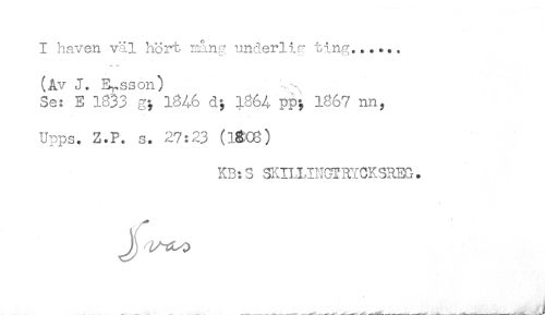//// I haven väl hort sång underlig ting...... //// — ^ //// (Av J. Ey-sson) //// Se: E 1833 g; 1%6 d; 1864 pp; 1867 nn, //// U- ps. Z.P. s. 27:23 (1&C8) //// KB:S SKILLINGIRYCKSREG. ////