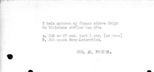 //// I hela naturen ej finnes större fröjd //// än kärlekens strålar kan giva //// s. 2(2 nr 27 end* text 1 str. (se ko:ir-i) //// P. Joh-nsson Berg Qster^tlnd. //// MUS. Ål^. FO-m^EL. ////