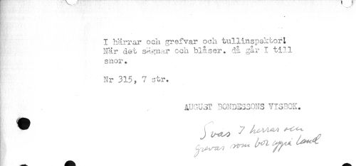 //// . //// I härrar och grefvar och tullinspektort //// När det segnar och blåser, då går I till //// snor * //// Nr 315, 7 str. //// * //// AUGUST BONDESSONS VISBOK. //// ^ J ^ 7 ^^ ////