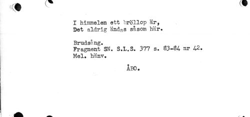 //// I himmelen ett bröllop är, //// Det aldrig ändas såsom här. //// Brudsång. //// Fragment SN. S.L.S. 377 s. 83-84 nr 42. //// Mel. hänv. //// ÅBO. ////