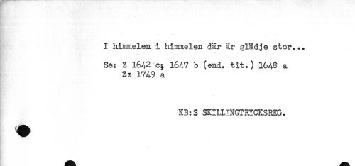 //// I himmelen i himmelen där är glädje stor... //// Se: Z 164.2 c; 1647 b (end. tit.) 1648 a //// Zz 1749 a //// KB:S SKULINGTRYCKSREG. ////