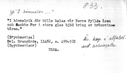 //// ^^ - //// y //// ! //// hinmelrik där hölls kalas vår Herre fyllde åren //// och Sankte Per i stora glas bjöd kring av brännvins^ //// tåren.** //// (Dryckesvisa) Z //// Dal. Grangärde, 11482, s. 499-5 03 ^ ^ ^ //// (Dryckesvisor) . ^^ //// ULMA. ////