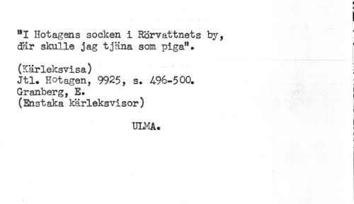 //// ) //// "I Hotagens socken i Rörvattnets by, //// där skulle jag tjäna som piga". //// (Kärleksvisa) //// Jtl. Hotagen, 9925, s. 496-500. //// Granberg, E. //// (Enstaka kärleksvisor) //// t //// ULMA. ! //// ) //// i //// i ////