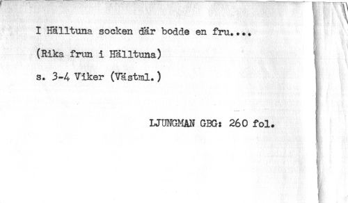 //// !! . \ //// I Hälltuna socken där bodde en fru.... //// - //// (Rika frun i Hälltuna) //// * //// s. 3-4 Viker (Västml.) //// LJUNGMÄN GBG: 260 fol. ' //// K-, ' //// Hj //// * .'i*''.'- HK?-'' ** //// H'' //// B'' //// K' ////