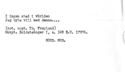 //// t //// t-'* //// I ingen stad i världen //// Jag byta vill med denna.... //// (not. uppt. Th. Freyland) //// Mskpt. Soldatsånger I, s. 328 E.U. 17976. //// ni //// NORD. MUS. ////