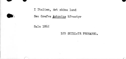 //// I Italien, det sköna land //// Se: Grefve Antonius afventyr //// Sala 1862 //// LUB SKILL:TR PROSARBG. //// i //// ! //// ! //// t //// T //// r ////