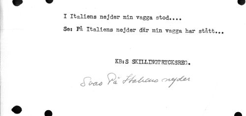 //// -— //// I Italiens nejder min vagga stod.... //// Se: På Italiens nejder där min vagga har stått... //// KB:S SKIHINGT RYCKSREG . ////