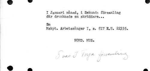 //// t //// I Januari månad, i Sekunda församling //// där drunknade en skräddare... //// ! //// Sm //// Mskpt. Arbetssånger I, s. 817 E.U. 22335. //// NORD. MUS. //// i //// t //// . //// . ^ / , . ////