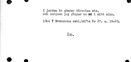 //// I jorden är gömder kärestan min, //// och sorgsen jag gångar nu xii i mitt sinn. //// 10:4 ? Svenssons sanl.häfte Nr 27. s. 19-20. //// ÅBO. ////
