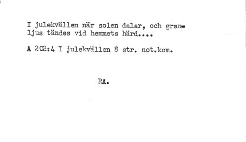 //// I julekvällen när solen dalar, och gran- //// ljus tändes vid hemmets härd.... //// A 2C2:4. I julekvällen 8 str. not.kom. //// RA. //// * ////
