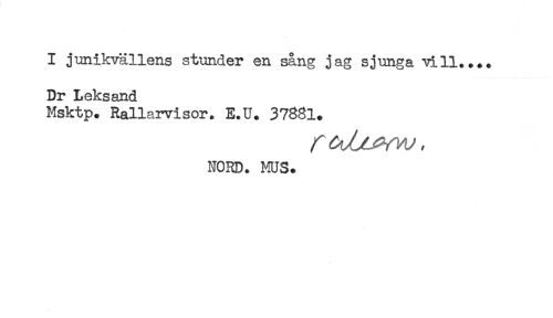 //// I junikvällens stunder en sång jag sjunga vill.... //// Dr Leksand //// Msktp. Rallarvisor. E.U. 37881. //// NORD. MUS. ////