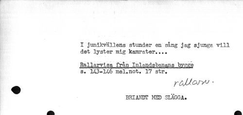 //// I junikvällens stunder en sång jag sjunga vill //// det lyster nig kamrater.... //// Rallarvisa från Inlandsbanans bygge //// s. 143-1A6 mel.not. 17 str. //// BRIåNDT HED SLÄGGA. ////