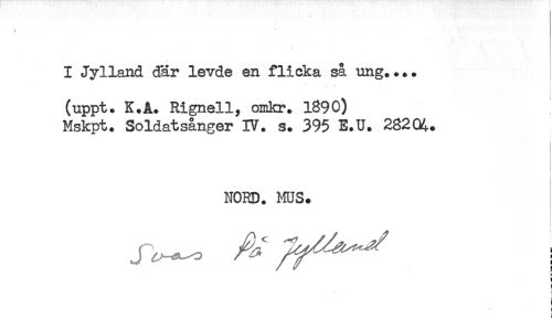 //// I Jylland där levde en flicka så ung.... //// . //// (uppt. K.A. Rignell, omkr. 1890) //// Mskpt. Soldatsånger IV. s. 395 E.U. 28204. //// t //// NORD. MUS. //// i //// i ////