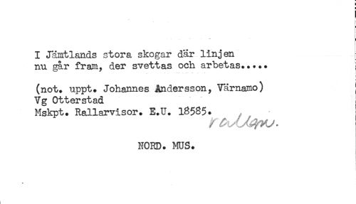 //// ! //// r //// < //// < //// < //// I Jämtlands stora skogar där linjen //// nu går fram, der svettas och arbetas....* i //// (not. uppt. Johannes åndersson, Värnamo) j //// V g Otterstad i //// Mskpt. Rallarvisor. E.U. 18585. //// NORD. MUS. ////