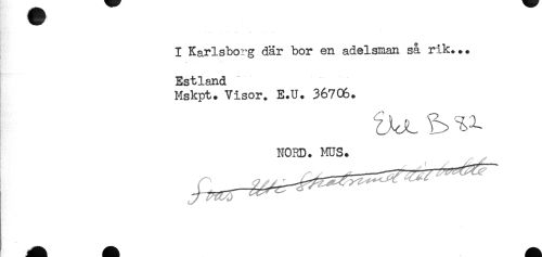 //// H H. //// ....... - -< . - //// I Karlsborg där bor en adelsman så rik... //// Estland //// Mskpt. Visor. E.U. 36706. //// tu. ^ //// NORD. MUS. ////