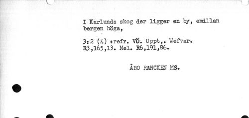 //// I Kar lunds skog der ligger en by, eiaillan //// bergen höga, //// 3:2 (A) +refr. VC. Uppt,. Wefvar. //// R3,165,13. Mel. R6,191,S6. //// ÅBO RANCKEN MS. ////