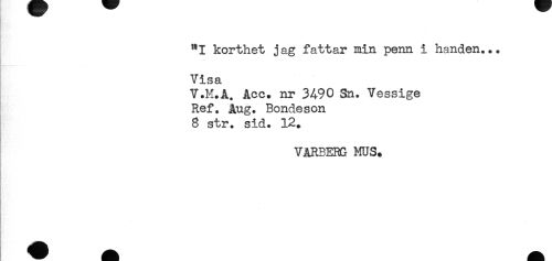 //// ...... *-' //// "I korthet jag fattar min penn i handen... //// Visa //// V.M.A. Acc. nr 3490 Sn. Vessige //// Ref. Aug. Bondeson //// 8 str. sid. 12. //// VARBERG MUS. ////