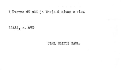 //// I Kvarna dä skä ja börja å sjung e visa //// 11482, s. 692 //// ULMA BLIXTS SAML. ////
