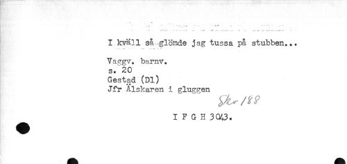 //// - //// t ' '*- *; * * * "-1-* r -- ' ' - r - . ., //// - //// I kväll så glömde jag tussa på stubben... //// -T. . t*' - .....' . — ^ T ? //// Vaggv. barnv. //// s. 20 //// Gestad (Dl) //// + * ^ //// Jfr Älskaren i gluggen //// ^ I F G H 3043. ////