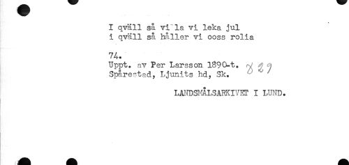 //// I qvall så vi la vi leka jul //// i qväll så håller vi ooss rolia //// t * //// 74. //// Uppt. av Fer Larsson 1890-t. <)( 4 ^ //// Spårestad, Ljunits hd, Sk. //// LAI€)SMÅLSARKIVET I LUND. ////