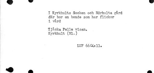 //// I Kyrkhults Socken och Rörhulta gård //// där bor en bonde som har flickor //// i vård //// Tjåcka Pelle visan. //// Kyrkhult (Bl.) //// . //// LUF 6604:11. //// j ////