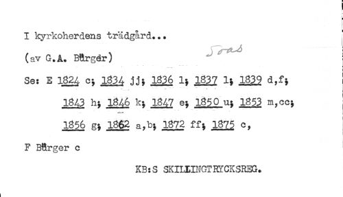 //// r //// < //// I kyrkoherdens trädgård... //// (av G.A. BArggr) //// Se: E 182^ c; 1834 jj; 1836 1; 1837 1; 18^2 d,f; //// - ' .. - ^ - - //// 1843 h; 1846 k; 1847 e; 1850 u; 1853 m,cc; //// 1856 g; 1862 a,b; 1872 ff; 1872 c, //// ! //// < //// F Bärger c //// KB:S SKILLD^GTRZCKSREG. ////