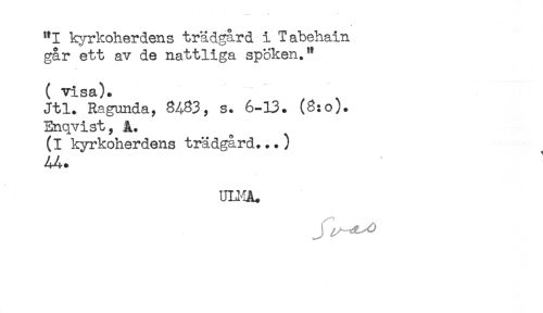 //// "I kyrkoherdens trädgård i Tabehain //// går ett av de nattliga spöken." //// ( visa). //// Jtl. Ragunda, 8483, s. 6-13. (8:0). //// Enqvist, å. //// (i kyrkoherdens trädgård...) //// ULMå. ////