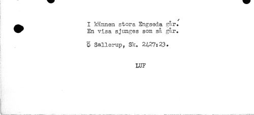 //// ^^ I kännen stora Engseda går. //// ^^ En visa sjunges som så går. //// % //// 3 Sallerup, Sk. 2^27:23. //// : //// ) //// ! //// LUF //// i //// Pi-- ////