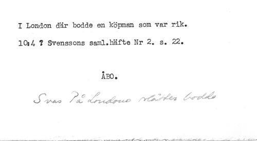 //// I London där bodde en köpman som var rik. //// 10:4 ? Svenssons saml.häfte Nr 2. s. 22. //// ÅBO. ////
