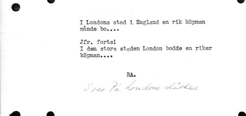 //// ...... //// I Londons stad i England en rik köpman //// månde bo.... //// Jfr. forts: //// I den stora staden London bodde en riker //// köpman.... //// : //// RA. //// ^ /ti. //// ! //// t '* ^^^^^^^ ////