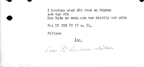 //// I Londons stad där stod en köpman //// som var rik //// Han ägde en enda som var dejelig och skön //// 8:4 LT INE 29 II s. 31. //// Juliana //// ÅBO. //// i //// I \ //// ! . r *. ___ ////