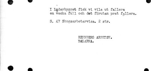 //// I I^derbygget fick vi vila ut fallera //// en vecka full och det förutan prat fallera. //// S. A7 Skogsarhetarvisa. 2 str. //// REHNBERG AR33TSV. //// DALAmA. ////